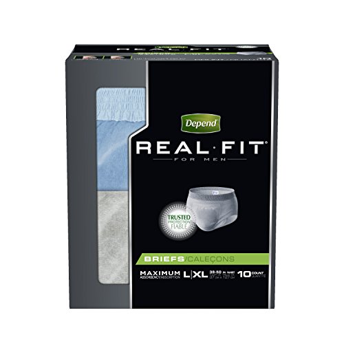 - Depend Real Fit for Men Briefs with Maximum Absorbency are available in Small/Medium (28-40 in. waist) and Large/XL (38-50 in. waist) sizes