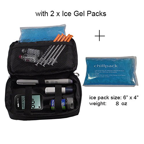 It's roomy, can fit all of testing supplies. have an odd-shaped, rather squat lancing device, and the elastic in the base holds it nicely. the sturdy construction. Bag Size:8" x 5" x 1.75" Material: Polyester Ice Pack Contents:Non Toxic Gel (Made in USA) Keep your insulin, medicines and other products . Simply freeze and use, simply put the ice mat in a quart pouch until through security, then unfold for complete cooling coverage.Ice Mat is made in USA and product is assembled in USA. Ice Pack gel is non Toxic , keeping all chemicals away from your foods or medicine.