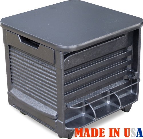 Made in USA! By DINA MERI leader in Salon equipment manufacturing. This unit features: HIGH IMPACT ABS PLASTIC CONSTRUCTION BODY, LAMINATED SEAT. Melamine Black Laminate top, 2 assorted trays "easy-roll" roll-up door and 2 side pockets with "tip-preventing" dividers and wire support for additional product storage. ( PHOTO #2 SHOWS UNIT AT WORK PRODUCT NOT INCLUDED, enclosed trays could be: open or with 2 or 4 dividers)Color: Black Overall Dimensions: 16"w x 16"d x 18"h, Weight: 14 lbs. IMPORTANT: This pedicure is designed to hold up to maximum 220lbs, it does NOT have locking wheels, therefore on a smooth floor it might slide away.