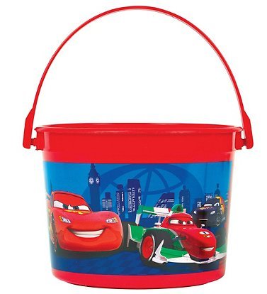 Our bright red Disney Cars 2 Favor Container features the hotshot racecar, Lightning McQueen, and the grand storyteller, Tow Mater, heading off to the WGP against a blue background with a convenient carrying handle. Fill Favor Container with fun party favors and toys or give as a party prize! Made of durable plastic. Disney Cars 2 Favor Container measures 4 1/2in deep with a 6 1/4in diameter.
