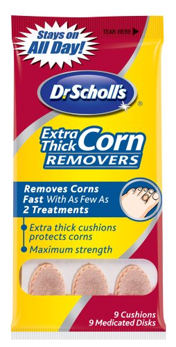 Dr. Scholl's Corn Removers FEATURESSoft felt pads cushion while medicated disks safely removes corns maximum strength! Patented Formulation Medicated Removes corns with as few as 2 treatments Removes corns safely and effectively Cushions corn from painful shoe pressure and friction. For the removal of corns. Relieves pain by removing corns. Corns form on the feet. Like calluses, corns are caused by the accumulation of special epidermal cells called keratinocytes. These cells accumulate in response to pressure or friction, usually over a bony prominence, like toe joints.