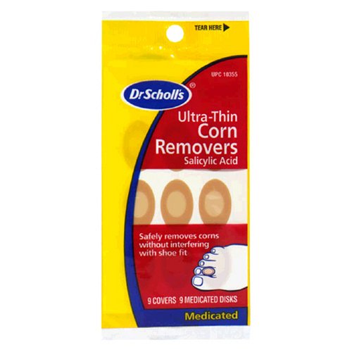 9 Pads; 9 Medicated Disks. Salicylic Acid. Safely removes corns without interfering with shoe fit. Ultra-thin cushion won't interfere with shoe fit. Thin, flexible cushion conforms to shape of foot. Won't catch on hosiery. Made in USA.