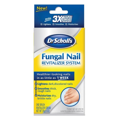 Dr. Scholl's Fungal Nail Revitalizer System guarantees healthier-looking nails in as little as 1 week. With 3X Triple Action System, it lightens dark, discolored nails; smoothes thick, rough nails and moisturizes dry, brittle nails. Contains a revitalizer cream plus a Buffer Brush to scrub away dark build up.