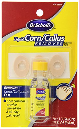 Dr. Scholl's Liquid Corn and Callus Remover works safely and effectively for fast, effective removal. The soft cushions relieve painful pressure while the medicated liquid with salicylic acid covers corns and calluses fully for complete removal. The self-stick waterproof adhesive holds the cushion in place. This removal kit is made in the USA.