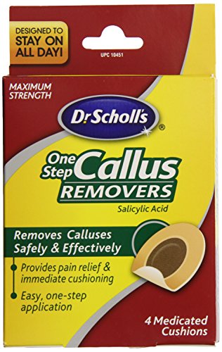 Dr. Scholl's One Step Callus Remover is a convenient one-step application. It comes with 4 medicated cushions. It is salicylic acid. All-in-one design removes calluses while providing pain relief and immediate cushioning. It contains medicated disk. The pain-relief cushion is made of patented formulation. It cushions as it heals. Pain-relieving cushion and remover in one make it easy to apply. It is clinically proven and safely removes calluses. It contains natural rubber latex. Made in USA.