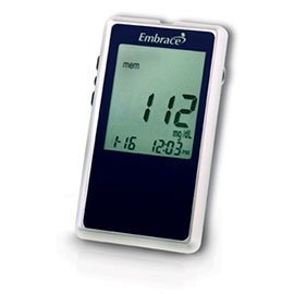 Embrace Blood Glucose Monitoring System. Contents: Embrace Meter Only, Carrying case, batteries, and Log Book.