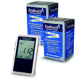 Includes: 1 Embrace No-Code Talking Meter Kit 100 Embrace No-Code Talking Glucose Test Strips The Embrace No Code Test Strip is the latest advancement in technology utilizing under fill technology and small sample requirements. Both of these features help provide a less painful and more accurate method of testing for the patient. Under fill technology helps insure that an adequate amount of blood has been applied to the strip and therefore reducing the possibility of creating a false low reading which commonly occurs in many test strips. A small sample size provides the patient a more painless testing method by allowing alternate site testing on places like the forearm and palm where there are less nerve endings. These features of the Embrace No Code Test Strip are all designed with one thing in mind, providing a more pleasant testing experience and keeping the patient compliant.