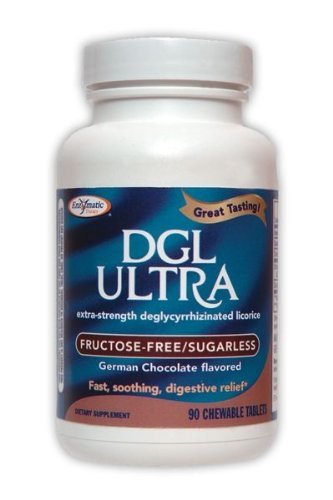 DGL Ultra Fructose Free - German Chocolate by Enzymatic Therapy Inc. 90 Chewable DGL Ultra Fructose-Free (extra-strength deglycyrrhizinated licorice) Fast soothing digestive relief German Chocolate Why use a deglycyrrhizinated licorice (DGL) supplement Its a natural choice for healthy digestion DGL supports a healthy digestive system and helps provide soothing relief of and support for the stomach lining and intestinal tract. Why Take DGL Ultra Fructose-Free Fructose-Free Sugarless It works fast DGL Ultra Fructose-Free extra-strength deglycyrrhizinated licorice stimulates and accelerates natural protection in the digestive tract. Youll notice relief of occasional stomach discomfort immediately Its strong The potent 10 1 extract makes this product ultra-concentrated which means it provides immediate benefits and maximum absorption. It tastes great and its fructose-free and sugarless too DGL Ultra Fructose-Free is chewable because saliva enhances the effect of its natural compounds.