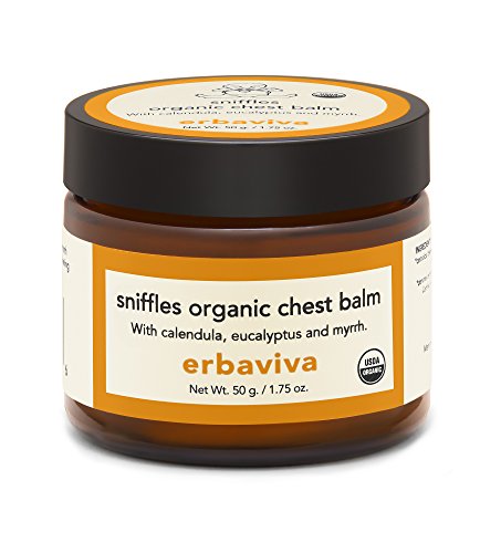 An organic natural alternative to ease baby through cough and cold season, Sniffles Organic Chest Balm is expertly formulated with essential oils of eucalyptus, tea tree, and myrrh, which are known to be immune boosting and lend powerful antiviral and antibacterial properties. Calendula, lavender and chamomile naturally comfort baby, while cypress and helichrysum essential oils effectively deliver healing and antiviral elements. Apply to baby's chest, back, neck and behind the ears to relax and soothe. Great smelling, purely natural and petroleum free. USDA Certified Organic.