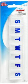 Are you among those people who often forget to take their medicines? Is it confusing for you to carry or store systematically your medicine strips? This Large 7 Day Pill Minder made of plastic takes care of the problem. The sleek and translucent weekly pill organizer has seven compartments, one for each day of the week. Every compartment of this weekly pill organizer is labeled in bold blue colored letters. Each letter printed on the compartments of this medication minder stand for the first initial of the days of the week. This medication minder will help you organize your medicines for a whole week at one go. Each compartment of this pill planner holds over 6 pills each. The snap tight lids of this pill planner keep each compartment tightly shut ensuring the medicines stay fresh throughout the seven days. The convenient size of the pill organizer does not take up too much space on your counter top and is easy to carry around in your handbag when you are out at work. Compartments labeled according to days of the week .
