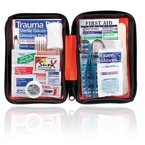 Perfect for hiking, camping, marine adventures, home and auto. This 205pc. outdoor softsided kit, which features all the essential first aid items for minor aches and injuries. Supplies are easy to find in the clear-pocket pages. Kit includes: first aid guide, accident report form, vinyl gloves, sunblock, lip ointment, blister prevention, insect sting relief pads, assorted bandages and gauze dressings, antiseptics, ointments including burn relief, and more.