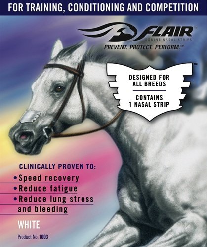 FLAIR® Equine Nasal Strips are designed to reduce fatigue and improve respiratory health in horses. They are self-adhesive strips that promote optimum respiratory health of equine athletes at all levels by reducing airway resistance and providing improved airflow when your horse needs oxygen most. During exercise when horses begin to breathe hard the soft tissues overlying the nasal passages are sucked in, reducing the airway diameter. This reduction in diameter causes greater resistance to airflow into the lungs. FLAIR Strips gently support the soft tissues over the nasal passages providing reduced airway resistance during exercise. They provide benefits for all horses including intensively trained horses as well as for horses that only exert themselves during occasional weekend competitions or trail rides. Each strip is for one-time use.