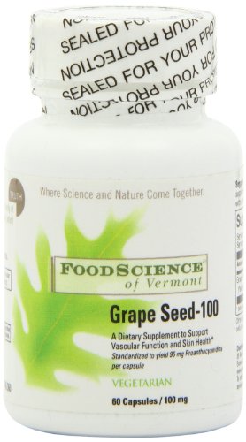 Food Science of Vermont's grape seed is a dietary supplement to support vascular function and skin health. Our grape seed extract is standardized to yield 95 mg (95%) proanthocyanidins (PCOs) per 100 mg capsule and 47.5 mg (95%) proanthocyanidins per 50 mg capsule. PCOs are a special class of water soluble bioflavonoids that are potent antioxidants. PCOs prevent the release of histamine from mast cells thereby reducing the adverse effects of histamine. PCOs support capillary strength. Weak capillaries can contribute to bruising, elastin and collagen dysfunction, edema and circulatory insufficiencies.