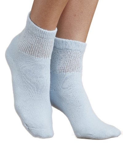 Bring comfort to every step with the soothing support of these Diabetic & Circulatory Comfort Socks. Made by Foot Care, these non-binding women's socks help to alleviate symptoms of diabetes, circulatory problems, swelling and excessive perspiration. Made of a soft cotton-nylon-spandex blend, these ankle socks have a non-binding top, extra width in the calf and a smooth toe seam. * 89% Cotton, 10% Nylon, 1% Spandex * Non-binding top with extra width in calf * Smooth, comfortable toe seam * Ideal for diabetic symptoms, circulatory problems, sensitivity, swelling of feet, and excessive perspiration * USA * See colors below * Machine wash and dry * One Size fits shoe sizes 9-11* Packaged 2 per pack (One White, One Color in each pack)