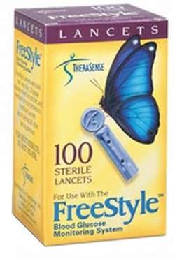 SKU NUMBER: 595397The Mininimum EXP date on product:1year.TITLE DESCRIPTION: FreeStyle Sterile Lancets 100 eaMANUFACTURER:THERASENSE.PRODUCT DESCRIPTION:For use with the FreeStyle Blood Glucose Monitoring System.25 gauge sterile lancets. Can be used with most lancing devices.SUGGESTED USE:Wash the selected test site with warm soapy water, and dry. Insert lancet into the FreeStyle lancing device and twist off the safety cap. Lance your forearm with the lancing device, and hold it in place until you see a sample the size of a pinhead. Hold lancing device over a puncture-proof container and pinch the white clip to release the lancet.