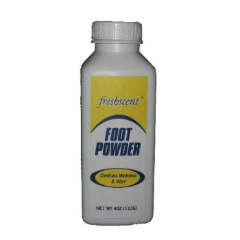 Freshscent 4 oz Foot Powder. Bottle is 5" tall. 2" Wide x 1.5" Deep. Rectangular with rounded edges. These foot care products are priced right.