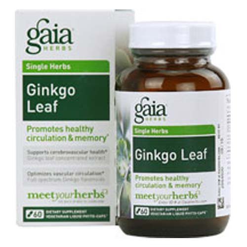 Ginkgo Leaf by Gaia Herbs 60 VegCap Ginkgo Leaf Promotes healthy circulation and memory Ginkgo contains antioxidants that relax the blood vessel walls. This allows more blood to flow to the brain supporting cognitive function and memory. Each serving of Gaia's certified organic Ginkgo leaf in Liquid Phyto-Caps provides a guaranteed 24 active Ginkgo flavonoid glycosides plus the full spectrum of phytochemicals that exist naturally in the whole leaf. Supports cerebrovascular health Optimizes vascular circulation Suggested Use As a dietary supplement Take 2 capsules in the morning and 1 capsule in the evening. or as directed by your healthcare professional. Supplement Facts Serving Size 3 Capsules Servings Per Container 20 Amount Per Serving Daily Value Calories 30 Total Alcohol Free Extract Ginkgo Leaf 2 070 mg Ginkgo Flavonoid glycosides 30 mg Contains the equivalent of 24 ginkgo Flavonoid Glycosides Certified Organic Ingredient Percent Daily Values are based on a 2 000 calorie diet Ot