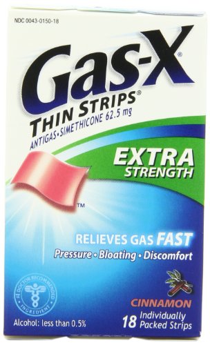 Simethicone. Relieves gas fast. Pressure; Bloating; Discomfort. Mouth-refreshing feel. 18 Individually packed strips. Extra Strength Gas-X Thin Strips offers fast, effective, and convenient relief of pressure and bloating. They melt on your tongue so you