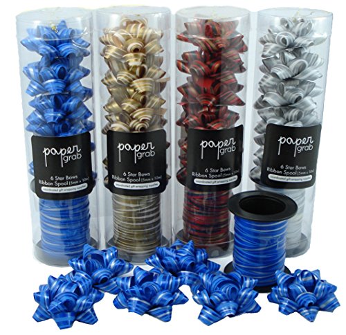 These lovely matching gift wrapping bows and curling ribbon are a pack of four styles. Silver, Gold, Blue and Red. The gift bows are 2 inch diameter.
