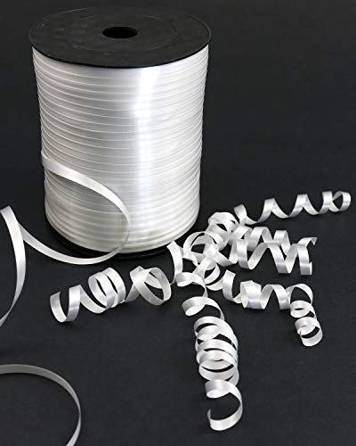 White Curling Ribbon. Use this curling ribbon to add frills here and there! It's ideal for creating balloon strings or tying to wedding gifts, holiday packages or birthday presents! Use it to decorate at parties by putting coiled ribbons on tables or in glasses! This strong, deep crimp polypropylene ribbon is 100% waterproof. 500 yards.