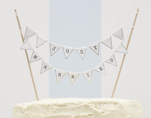 Fabulous miniature bunting cake topper, with tiny cotton triangle flags printed with letters spelling out Just Married. The two rows of bunting hang between two stick which are included in the box.