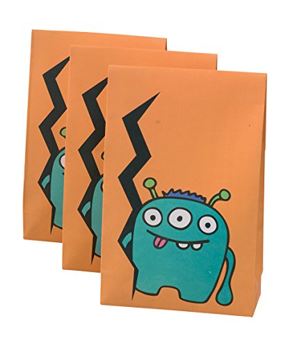 Bright orange monster Party Bags with a blue 3 eyed monster on the side trying to break out of the bag. Each bag has a green sticker to close the top over and keep the parties goodies in.