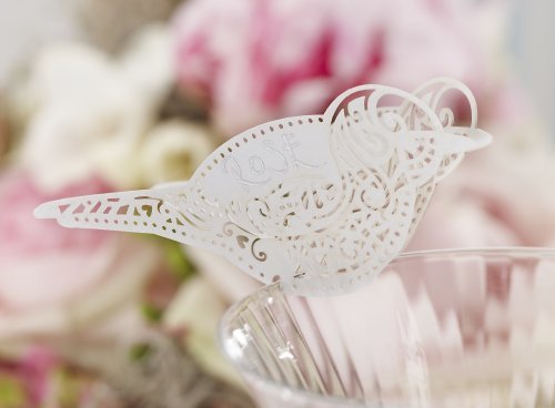 These charming bird shaped cards sit on the side of a glass and can be used as name place cards or simply as a decoration. They are delicately laser cut giving them a transparent and sheer appearance and add a touch of elegance to your table. Each pack contains 10 cards. Measurement 9.5cm W and 3.3 cm H