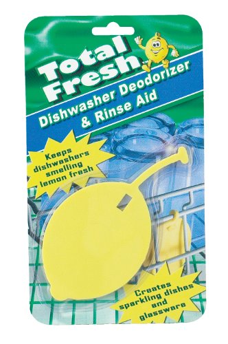 From the makers of Plink, Total Fresh is a deodorizer and a rinse aid for the dishwasher. It keeps dishwashers smelling lemon fresh while creating sparkling dishes and glassware. Wrap the tie around the top of the dishwasher rack and secure it into the slot - Total Fresh emits a lemon fragrance while a dishwasher is operational and while it's standing, and acts as a rinse aid during use. Total Fresh is safe, resistant to high temps and good for up to 21 washes. Simple directions for use on package.