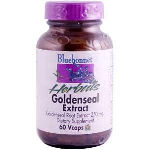 Goldenseal 250mg by Bluebonnet 60 VegCap Goldenseal 250mg 60 VegCap Product Bluebonnets Standardized Goldenseal Root Extract Capsules provide a standardized extract of alkaloids the most researched active constituents found in goldenseal. A clean and gentle water-based extraction method is employed to capture and preserve goldenseals most valuable components. Available in easy-to-swallow vegetable derived capsules for maximum assimilation absorption and for a truly vegetarian vegan formula. Supplement Facts Amount Per Serving Daily Value Goldenseal Root Extract(Hydrastis canadensis L. standardized to 5 12.5 mg alkaloids) 250 mg Daily Value Not Established Percent Daily Values are based on a 2 000 calorie diet Other Ingredients 100 Kosher vegetable capsules vegetable cellulose vegetable magnesium stearate silica. Does Not Contain Free of milk egg fish crustacean shellfish tree nuts peanuts wheat and soybeans. Also free of yeast gluten barley rice sodium and sugar. Warnings Keep out of