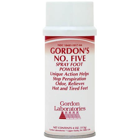 An aerosol spray foot powder, Gordon's No. 5 wards off perspiration odor and the burning and itching of athlete's foot. Its pleasantly scented mist gets between the toes. Ingredients: SD Alcohol 40, Talc, Aluminum Chlorhydrate, Cyclomethicone, Bentone 38, Propylene Carbonate, Isopropyl Myristate, Menthol, Undecylenic Acid, Fragrance, Isobutane, Propane.
