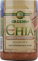 Omega3 Chia™ Chia (pronounced chee’ah), is the richest and only unprocessed, whole food source of pure Omega3. A member of the min family, Chia is native to Central America and has been used traditionally for over 3000 years. Ancients Aztec warriors prized Chia s an endurance promoting Superfood, eating it in bread just before battle and drinking it in water before funning long distances. Due to it’s high fiber content, Chia seed absorbs up to ten times its weight in water, making it an excellent source of hydration. Omega3 Chia’s soluble fiber forms a gel that slows the absorption of sugar into the bloodstream, binds it to toxins in the digestive system, and helps eliminate waste. Omega3 Chia is especially rich in essential fatty acids. One 15g serving provides more than 3g of Omega3 (as alpha linoleic acid) and 1g of Omega6 (linoleic acid) in a perfectly balanced 3:1 ratio, making it the richest, unprocessed and fully-difestible whole food source of Omega3. Ingredients and Nutritional Information Ingredients: 100% Chia seed (Salvia hispanica L.) Directions: Simply mix one scoop (15g) of Omega3 Chia seed with 8 oz. of lemonade, thin juice, or your favorite beverage. In a Greens Plus shaker cup or resalable bottle, shake periodically for a few minutes until the Chia seed becomes evenly suspended, then sip for a refreshing performance-enhancing energy drink. The unique texture of mixed Chia seed is a feature of it's high fiber content and water binding capacity. For maximum benefit, drink at least 64 oz. of pure water every day. Omega3
