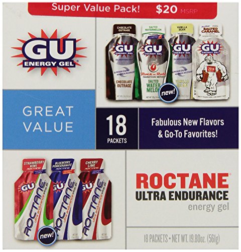 In 1994 GU Energy Gel forever changed the way athletes fueled during exercise. It has since become the mainstay energy source for legions of elite athletes and everyday competitors worldwide. Until recently, Roctane Ultra Endurance Energy Gel existed as a fabled silver packet available only to a select few endurance athletes who competed in the world's toughest events. Since its public release, Roctane has exploded in popularity to become a vital nutrition tool for committed athletes pushing beyond what they thought were their limits. This Super Value Box provides an opportunity to test drive both options in a great range of new and established flavors. The box includes 10 packets of Original GU Energy Gel, which features an optimal carbohydrate ratio for lasting, quality energy, branched chain amino acids for additional fuel and focus, electrolytes to aid rehydration and antioxidants. The box also includes 8 packets of GU Roctane Ultra Endurance Energy Gel. Roctane features the proven carbs and electrolytes from GU but adds more and different branched chain amino acids for supplemental fuel, focus and recovery potential. Roctane is GU, to a higher power. The Super Value Box is available for a limited time only and contains a variety of new and best-selling flavors.