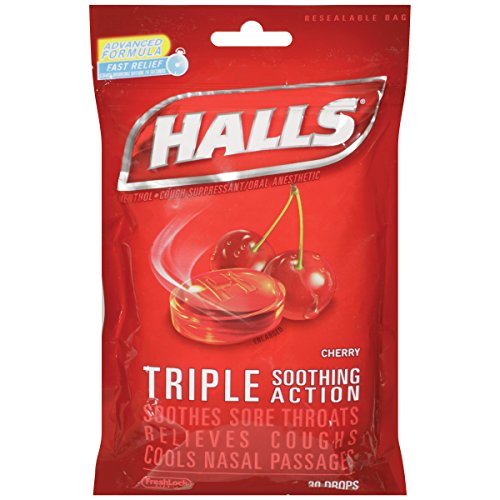 Enjoy this classic HALLS cough suppressant drops in Cherry flavor.HALLS fights coughs, soothes sore throats, and cools nasal passages. HALLS are formulated with Advanced Vapor Action for fast, effective relief that starts working within 10 seconds. Use the fast-relief of HALLS as a compliment to your allergy medication during allergy season when pollen, grass and trees can trigger irritating coughs and scratchy, sore throats. This order comes with 30 count Cough Drops Cherry flavored per package.