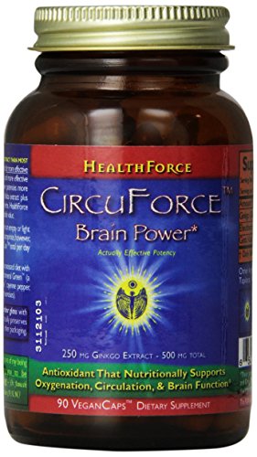 CircuForce™ Brain Power 90 VeganCaps™ Ginkgo Biloba III+ Double Strength! New name- CircuForce™ Brain Power. Ginkgo Biloba is a powerful antioxidant that nutritionally supports Oxygenation, Circulation, Brain Function, and so much more. 250 mg standardized Ginkgo Biloba Extract (24%) 125 mg Siberian Eleuthero 125 mg Gotu Kola Extract are added for 500 mg total) each VeganCap. Get the maximum value nutritionally and financially with HealthForce Ginkgo! Enhance the effectiveness of all nutritional supplements (including Ginkgo Biloba) by taking them with one or more of the following: Digestion Enhancement Enzymes, and Oxygen Supreme™. Caution! Due to Ginkgos natural effect of increasing blood circulation, let your doctor know if you are taking any pharmaceutical blood thinning medications, including aspirin, as your dosage may need to be monitored and/or altered. Suggested Usage: One VeganCap™ per day contains 400% more Ginkgo extract than most other products. However, for greater nutritional benefits (demonstrated in studies), consume 2 VeganCaps™ per day. Take, ideally, on an empty or light stomach, such as with fresh, raw juice, fruits, or vegetables. It is appropriate, however, to take with other foods or anytime. Siberian Eleuthero and Gotu Kola are added for their individual benefits.