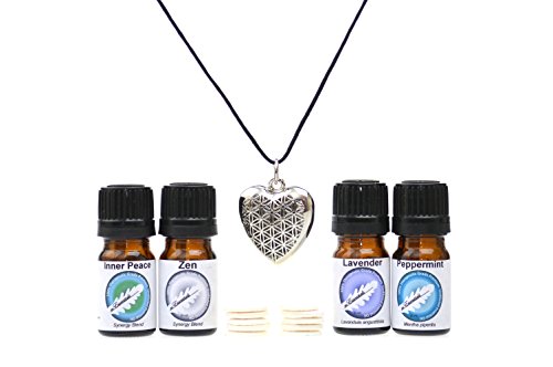 Gift Set Aromatherapy Diffuser Necklace Flower of Life Heart Locket on Alloy Ball Chain and Four 5 ml Premium Essentail Oils