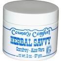 Herb Savvy-Comfrey Aloe Salve by Country Comfort 2 oz Cream Herb Savvy-Comfrey Aloe Salve 2 oz Cream Comfrey St. John's Wort Calendula and Aloe Vera is a powerful combination of very gentle herbs most effective to soothe burns sunburns rashes diaper rash insect bites and chapped or dry skin. You will be amazed how quickly it comforts. A natural salve no medicine chest should be without. Suggested Use As a dietary supplement Most effective to soothe burns sunburns rashes insect bites and chapped or dry skin. - Or as directed by your healthcare professional. Other Ingredients Safflower Oil Hazelnut-Pecan Oil Beeswax Comfrey StJohn's Wort Calendula Aloe Vera Vitamins E A D Warnings Keep out of reach of children. As with all dietary supplements consult your healthcare professional before use. See product label for more information.