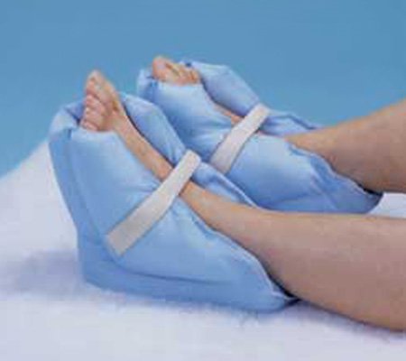 Heel Pillow designed to relieve pressure on feet, heels and ankles whether in bed or in a wheelchair. Useful for preventing tissue breakdown. Made from thick quilted polyester fill for comfort and protection. Adjustable hook and loop closure. One size fits all.