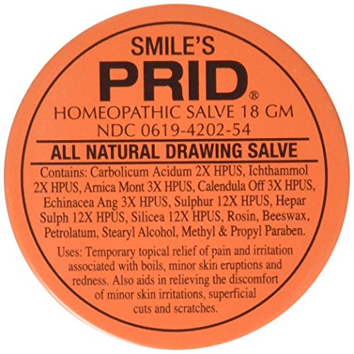 For over 50 years, PRID has been a must-have in both the family medicine chest and the tool box. PRID is a natural solution for healing skin from boils, blisters, ingrown hairs, splinters, thorns, minor skin irritations, cuts, scratches, wounds, burns, acne, skin eruptions, bug bites and more! Smile's PRID Drawing Salve provides a temporary topical relief of pain and irritation associated with boils, minor skin eruptions and redness. Also aids in relieving the discomfort of minor skin irritations, superficial cuts and scratches. Can be used in conjunction with other medications without side effects. PRID Drawing Salve is a traditional drawing salve that both soothes and protect wounds of the skin. Made with natural ingredients and made in the United States. Get yours now and say goodbye to pain and irritated skin! Always read and follow label directions. The uses for our products are based on traditional homeopathic practice. They have not been reviewed by the Food and Drug Administration.