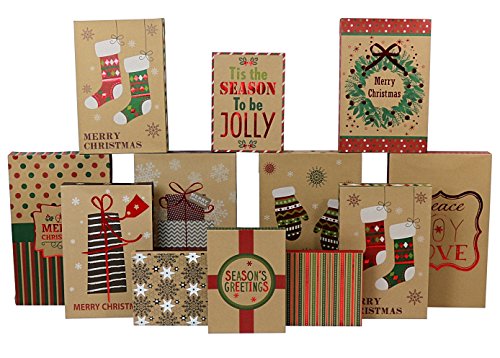 Why take time wrapping your presents when you can put them in a reusable gift box. Made from durable cardstock this set includes 4 each of 3 sizes; lingerie/accessories (8.25 x 11 x 1.5 inches), shirt (9.5 x 14.75 x 2 inches), and robe (11 x 17 x 2.5 inches). 12 boxes total. Random Designs.