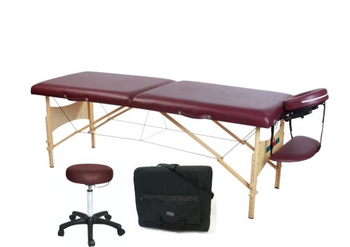 PVC leather upholstery is used to provide essential comfort. The table sets up and folds for storage in seconds and includes a strong, double-stitched carry bag with an accessory side pocket. The rolling massage stool matches the color and quality with the massage table. The Ironman stool has a chrome support cylinder, a towel hanger, and is easy to assemble. This adjustable-height stool utilizes 3-inches of thick foam for the user's comfort.