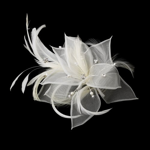 - Faux pearls, rhinestones, and seed beads subtly accent the mesh fabric flowers and stunning feathers in this piece.