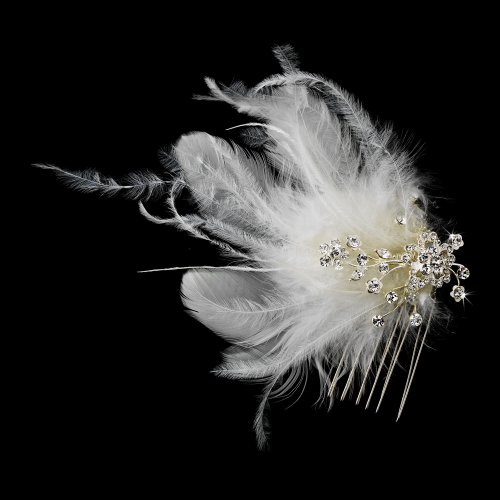 - This charming feather fascinator sprays to the right side of the comb from a floral rhinestone arrangement.