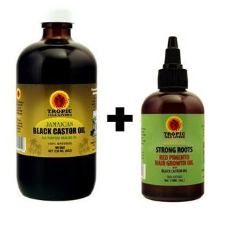 Black castor oil has an age old reputation as an all purpose healing oil. It's commonly used for hair and scalp problems, skin conditions, aches and pain, laxative, breast massage, fibroid, first aid, for cuts and wounds, burns and much more.////////////////////////////////Tropic Isle Living's STRONG ROOTS Red Pimento Hair Growth Oil strengthens, thickens and grows your hair. It increases blood flow to the scalp, supplies valuable nutrients to hair roots, stimulates hair follicles, strengthens hair shaft and help to remove toxins and parasites that could retard hair growth. Red pimento oil contains appreciable levels of the trace mineral, copper, which is beneficial to the hair in many ways.