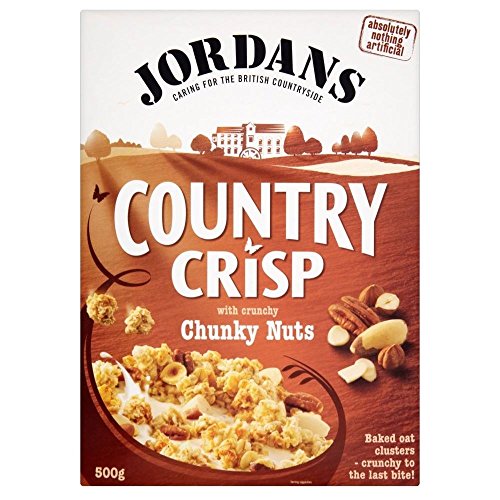 Jordan Country Crisp Chunky Nut is bursting with 15% nuts including flaked almonds, roasted hazelnuts, chopped brazil nuts and chopped pecans. The nuts are mixed with wholesome golden clusters of baked British wholegrains which include oat flake, barley flakes and oat flour, to give an irresistibly oaty bite with a richly nutty finish. . Jordans Country Crisp does not contain artificial flavourings, colourings or preservatives. Suitable for vegetarians. Non-GM. Very low salt.