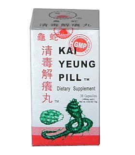 龟蛇清毒解痒丸 KAI YEUNG PILL (GUI SHE QING DU JIE YANG) Active ingredients Astragalus root, Dong Quai root, Ligusticum wallichii rhizome, Asian ginseng root, Fragrant angelica root, Cang-zhu atractylodes rhizome, Cnidium fruit, Xanthium whole plant, Rehmannia unprocessed tuber Functions and indications: Nourishing and quickening the blood, clearing heat and transforming dampness, eliminating toxin. Used for tumefaction and ringworm, skin heat-toxin, systemic skin itching, rheumatoid skin itching, red pox skin itching, hidden tumefaction, allergic dermatitis, inappetence, fantod and insomnia, damp-heat pudendal itch and scrotum itchy. Directions: Take 3-4 pills 2 times a day, half for children. Packing: 36 pills per box. Caution: Do not use if pregnant. This statement has not been evaluated by the Food and Drug Administration. This product is not intended to diagnose, treat, cure, or prevent any disease.