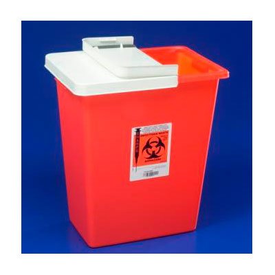 Application: Multi-Purpose Sharps Collector. Color: Red. Style: 1-Piece. Sterility: NonSterile. Volume: 8 Gallon. Feature: Lids can provide temporary closure when container is not in use to reduce exposure to contents. Feature: Nestable