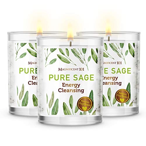 Magnificent101 Pure Sage Smudge Set of 3 Candles for House Energy Cleansing, Banish Negative Energy I Purification and Chakra Healing - Natural Soy Wax Candles for Aromatherapy (Pure Sage)