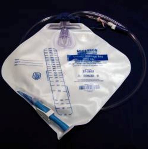 McKesson Medi-Pak Performance Urinary Drainage Bag 2000 mL from FirstOptionMedical.com features anti-reflux/flutter valve, two adjustable leg straps and easy-to-use drain valve for drip-free closure after draining. Universal-tiered connector fits indwelling or external catheters and tubing. Areas under protective caps and fluid pathways are sterile.