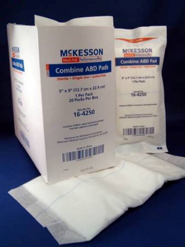 Brand or Series: Medi-Pak(TM) Performance Plus. Application: ABD / Combine Pad. Dimensions: 5 X 9 Inch. Material: Cellulose Tissue / NonWoven Outer Fabric. Sterility: Sterile. Shape: Rectangle. Feature: 5 inch x 9 inch (12.7 cm x 22.9 cm). Feature: Sterile. Feature: Non-woven outer fabric with inner cellulose tissue construction that helps provide maximum moisture barrier. Feature: Clean, white color. Feature: Sealed edges to prevent leaking. Feature: Superior absorption with virtually no linting. Feature: Faster wicking for drier wound sites. Feature: Single Use. Feature: Latex-Free. Feature: