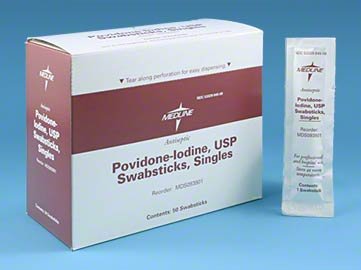 - Povidone Iodine Swabsticks Singles, Used to help prevent skin infections in cuts, scraps, abrasions and burns. 50 units per Box, New and Unoepend